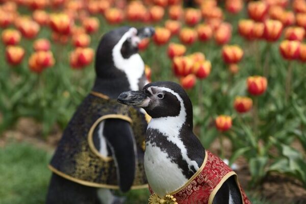 Two Humboldt penguins surprised visitors by strolling among tulip blossoms in Nanjing’s Zhongshan Botanical Garden, bringing joy to parkgoers this spring.